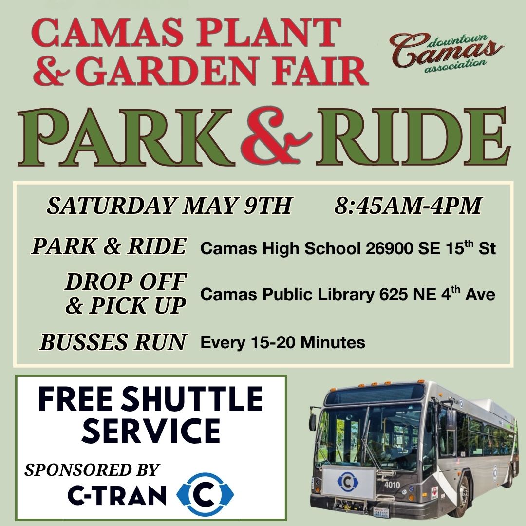The DCA is partnering with C-TRAN for a FREE shuttle service during the Plant Fair! Guests can park at Camas High School (26900 SE 15th St) and ride comfortably to the convenient drop-off by the Camas Library (625 NE 4th Ave). The shuttle will run continuously on May 10th with pick ups/drop offs every 15-20mins from 8:45 a.m. to 4:00 p.m., making it easy for visitors to enjoy the fair without worrying about parking! Riders are encouraged to use the convenient plant holding station on the corner of 5th Ave and Cedar Streets, hosted by Scout troop 562. Drive up and have the Scouts help you load your purchases after you’ve picked up your vehicle.